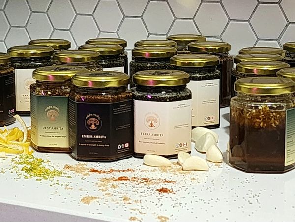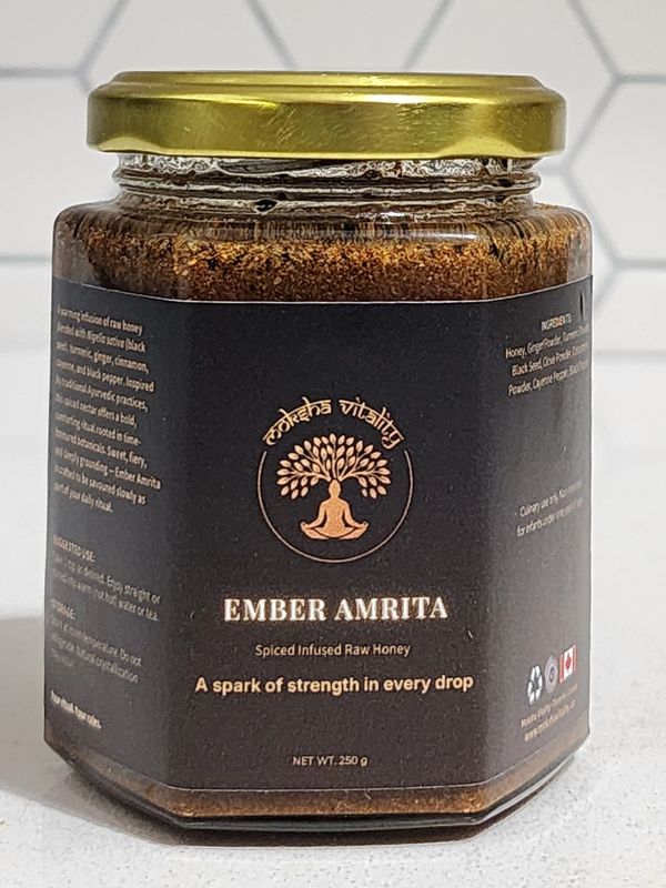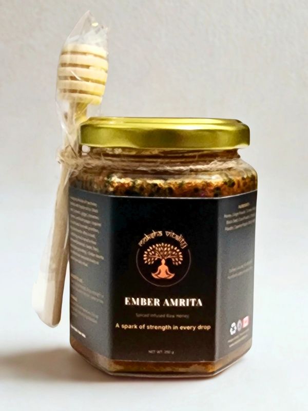 A potent fusion of raw honey infused with black seed, turmeric, ginger, cinnamon, cayenne, and black pepper — Ember Amrita delivers comforting warmth and natural relief when cold, cough, or flu symptoms arise. Inspired by Ayurvedic healing traditions, this spiced nectar soothes the throat, calms inflammation, and helps restore balance from within. Sweet, fiery, and restorative — a golden remedy born of nature’s own defense.