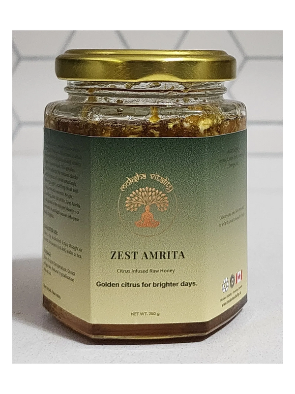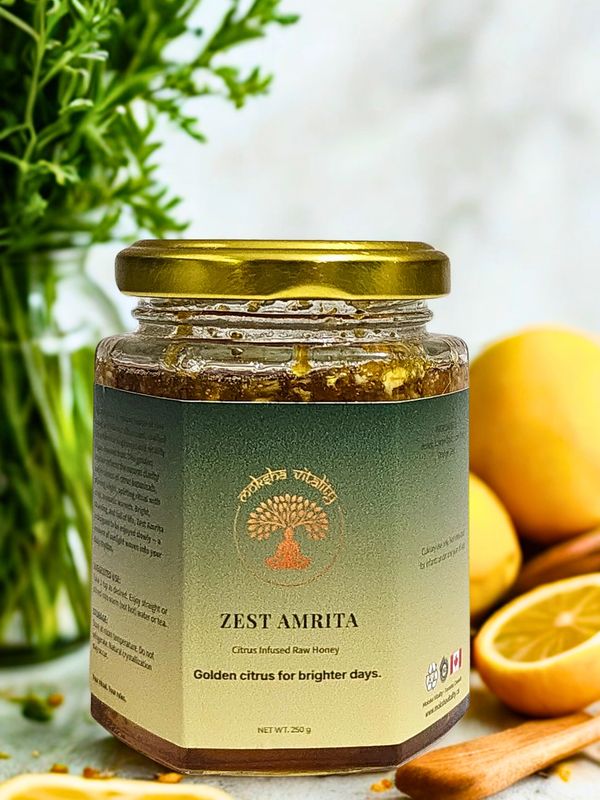 Zest Amrita blends raw honey with dried citrus peels to create a radiant remedy that uplifts and restores. Rich in natural vitamin C and antioxidants, this golden infusion soothes the throat, supports recovery from cold and flu symptoms, and refreshes the senses. Bright, cleansing, and full of life — Aura Amrita is sunlight captured in honey.