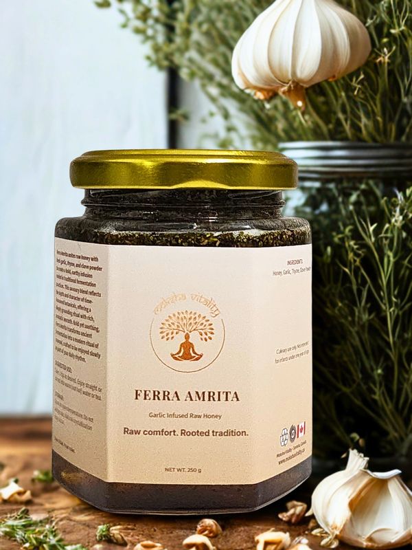 Ferra Amrita unites raw honey and fresh garlic to create a living remedy for cold, cough, and flu relief. Rich in natural enzymes and probiotics, this earthy infusion supports recovery by calming inflammation, easing congestion, and strengthening the body’s natural defenses. Bold yet soothing, Ferra Amrita transforms ancient fermentation into a modern ritual of renewal.